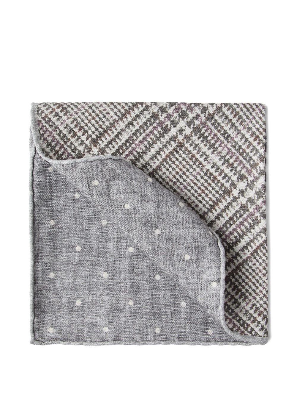 silk pocket square Highlights - Light grey - Plaid check pattern - Polka dot print - Reversible Made in Italy Composition Silk 100% SIZE & FIT Measurement LENGTH 13.77 in(35 cm) WIDTH 13.77 in(35 cm)