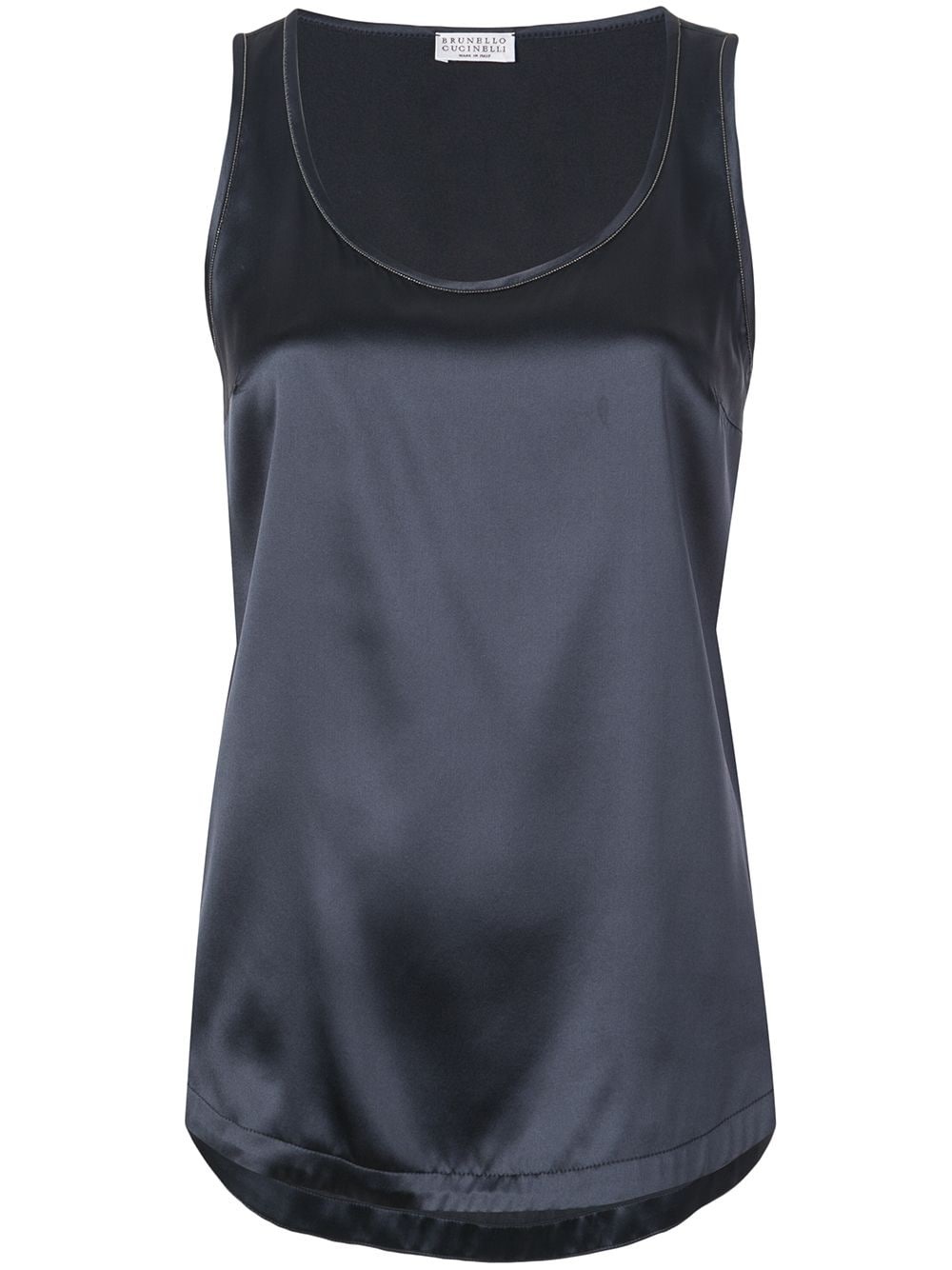 silk tank top Navy blue silk tank top from Brunello Cucinelli featuring a round neck, a sleeveless design and a relaxed fit. Made in Italy Composition Silk 96%, Spandex/Elastane 4% SIZE & FIT Model measurements Height 5 ft 10 in(1.79 m) Bust/Chest 31.1 in(79 cm) Hips 33.85 in(86 cm) Waist 22.83 in(58 cm) Washing instructions Dry Clean Only