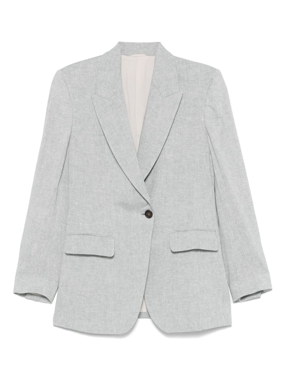 single-breasted blazer Highlights - Grey - Front button fastening - Two side flap pockets - Long sleeves - Buttoned cuffs Made in Italy Composition Outer: Eco Brass 100%, Linen/Flax 97%, Polyester 2%, Polyamide 1% Lining: Acetate 74%, Silk 26%