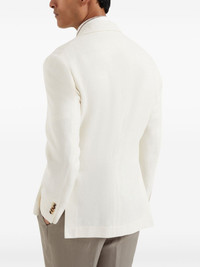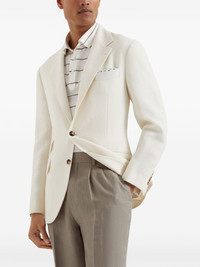 single-breasted blazer Highlights - White - Linen/virgin wool/silk/cotton - Notched lapels - Front button fastening - Long sleeves - Buttoned cuffs - Chest welt pocket - Three side flap pockets - English rear vents Made in Italy Composition Linen/Flax 43%, Virgin Wool 21%, Silk 21%, Cotton 15% Washing instructions Dry Clean Only