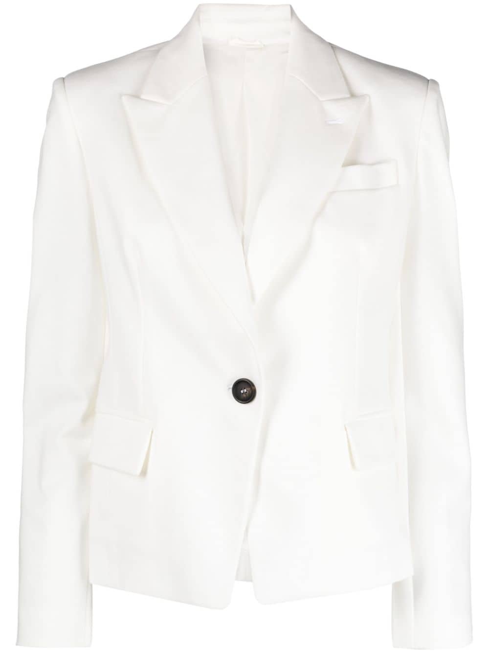 single-breasted cotton-blend blazer Crafted in a classic single-breasted silhouette, this blazer by Brunello Cucinelli is constructed from a cotton blend in an off-white colourway for a minimalist aesthetic. Highlights - Off-white - Cotton blend - Tailored design - Peak lapels - Front button fastening - Long sleeves - Buttoned cuffs - Chest welt pocket - Two front flap pockets - Straight hem Made in Italy Composition Lining: Acetate 65%, Polyester 35% Outer: Cotton 78%, Polyamide 16%, Spandex/Elastane 6% SIZE & FIT Model measurements Height 5 ft 10 in(1.77 m) Bust/Chest 32.67 in(83 cm) Hips 35.43 in(90 cm) Waist 23.62 in(60 cm) FittingInformation Designed for a slim fit that sits just away from the body offering a close yet comfortable fit The internal shoulder pads offer a structured shape Made from a midweight fabric This piece fits true to size – take your usual size
