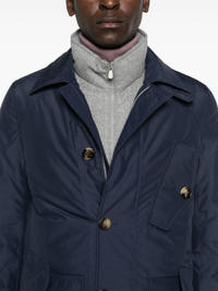 single-breasted padded jacket Highlights - Navy blue - Shell - Water-repellent - Padded design - Classic collar - Front button and zip fastening - Internal drawstring fastening waist - Long sleeves - Buttoned cuffs - Chest flap pocket - Two side flap pockets - Straight hem - Full lining Made in Italy Composition Outer: Polyamide 56%, Virgin Wool 22%, Silk 22% Lining: Nylon 100% SIZE & FIT Model measurements Height 6 ft 2 in(1.87 m) Bust/Chest 36.41 in(92.5 cm) Hips 37 in(94 cm) Waist 29.52 in(75 cm) FittingInformation Designed for a regular fit, allowing for a comfortably loose fit throughout the body The adjustable drawstring means that you can adjust this piece’s fit to suit your comfort and preference Made from a padded non-stretch fabric, giving it no natural elasticity This piece fits true to size – take your usual size Measurement CHEST 45.66 in(116 cm) SLEEVE LENGTH 25.98 in(66 cm) LENGTH 33.07 in(84 cm) WAIST 44.09 in(112 cm)