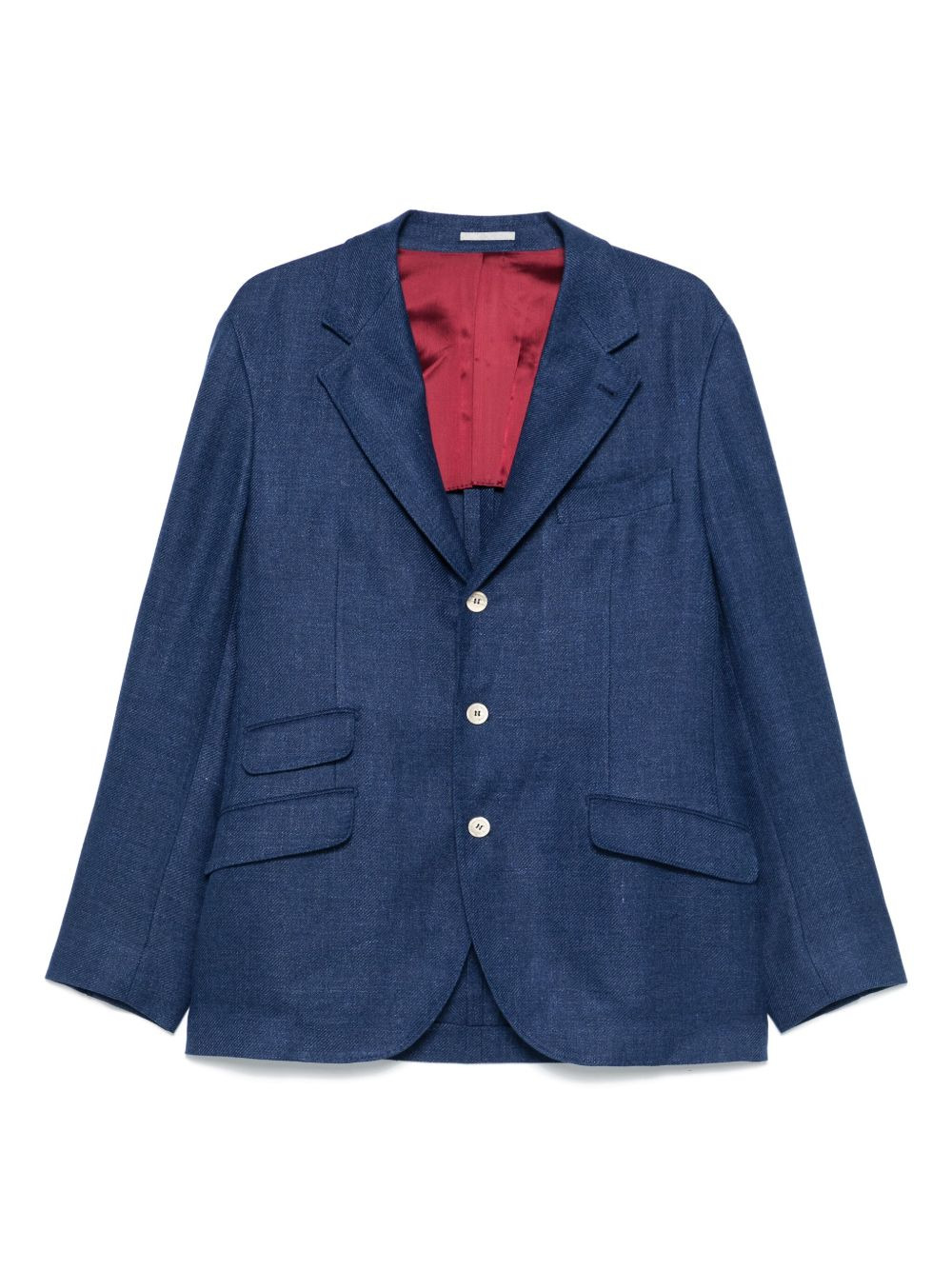 single-breasted tailored blazer Highlights - Navy blue - Linen blend - Classic lapels - Front button fastening - Three side flap pockets - Long sleeves Made in Italy Composition Outer: Linen/Flax 74%, Wool 24%, Silk 2% Lining: Cupro 100% SIZE & FIT Model measurements Height 6 ft 2 in(1.87 m) Bust/Chest 36.41 in(92.5 cm) Hips 37 in(94 cm) Waist 29.52 in(75 cm) FittingInformation Designed for a slim fit, offering a comfortable fit that sits just away from the body The vented hem offers movement at the rear Made from a midweight non-stretch fabric Measurement CHEST 44.48 in(113 cm) SLEEVE LENGTH 25.59 in(65 cm) LENGTH 30.7 in(78 cm) WAIST 42.12 in(107 cm) Washing instructions Dry Clean Only
