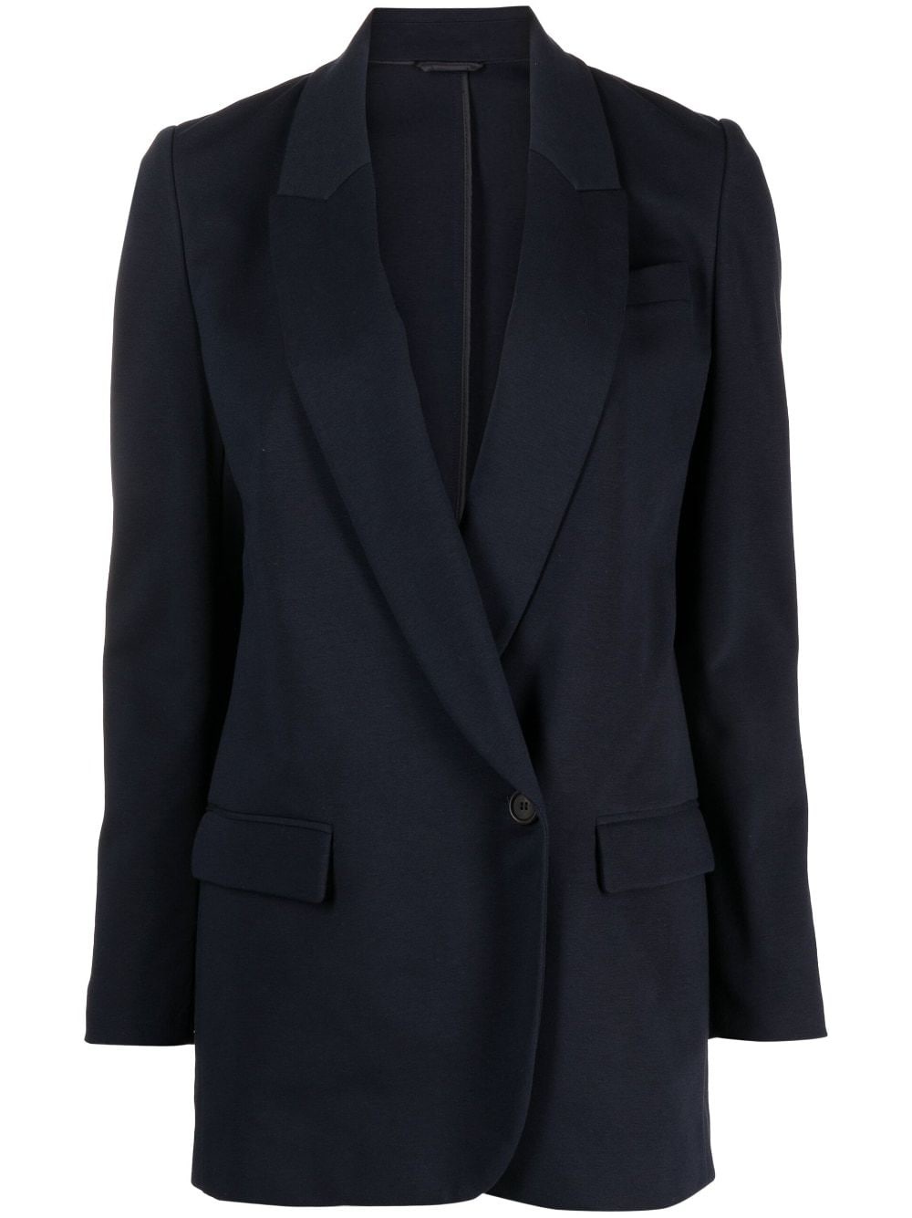 single-breasted tailored jacket This Brunello Cucinelli double-breasted blazer brings the traditions and the Italian craftsmanship the brand is known for. The blue-hued garment is crafted from a cotton blend and topped with multiple front pockets. Highlights - Navy blue - Cotton blend - Peak lapels - Front button fastening - Long sleeves - Buttoned cuffs - Chest welt pocket - Two front flap pockets - Straight hem Made in Italy Composition Outer: Cotton 78%, Polyamide 16%, Spandex/Elastane 6% Lining: Acetate 74%, Silk 26% SIZE & FIT Measurement SLEEVE LENGTH 23.62 in(60 cm) LENGTH 29.13 in(74 cm)
