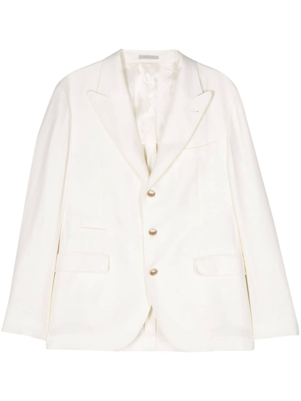 single-breasted twill blazer Highlights - Off-white - Linen-wool blend - Twill weave - Peak lapels - Long sleeves with buttoned cuffs - Chest welt pocket - Front welt pocket - Two front flap pockets - English rear vents - Multiple internal slip pockets - Partial lining - Front button fastening Made in Italy Composition Outer: Linen/Flax 74%, Wool 24%, Silk 2% Lining: Cupro 100%