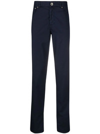 straight leg chinos Indigo blue stretch cotton straight leg chinos from Brunello Cucinelli featuring a waistband with belt loops, a button and zip fly, a five pocket design and a leather brand patch to the rear. Made in Italy Composition Outer: Cotton 97%, Spandex/Elastane 3% Lining: Cotton 100% SIZE & FIT Model measurements Height 6 ft 2 in(1.89 m) Bust/Chest 36.22 in(92 cm) Hips 37.79 in(96 cm) Waist 29.52 in(75 cm) FittingInformation This piece fits true to size. We recommend you get your regular size Cut for a slim fit Made with a mid-weight stretch fabric Washing instructions Machine Wash