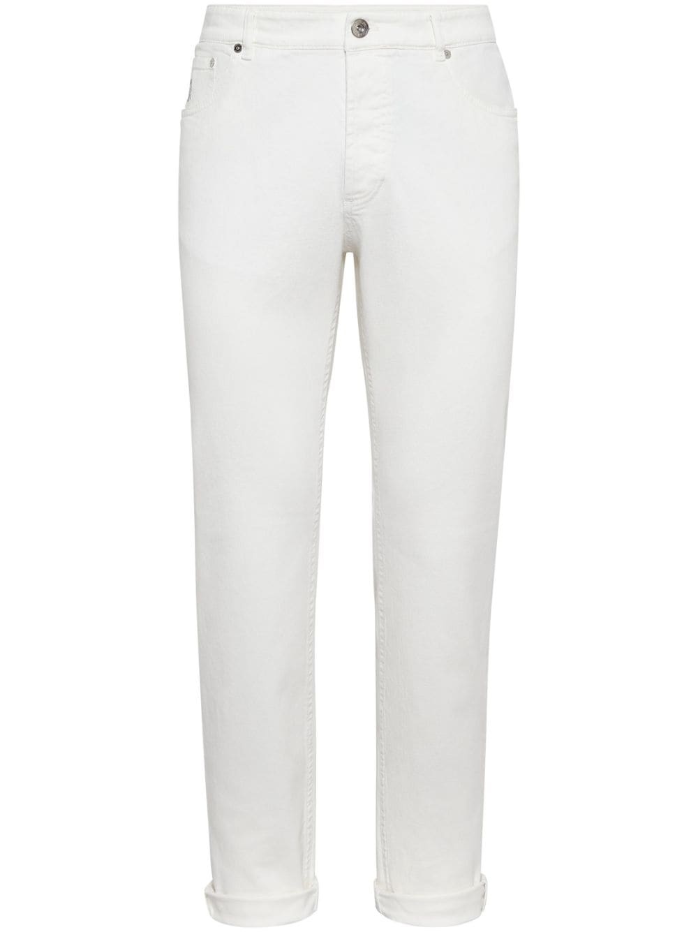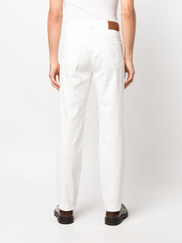 straight-leg denim jeans Brunello Cucinelli pairs modern designs with classic Italian craftsmanship. Seen on this pair of denim jeans, a monochromatic hue and sleek, straight-leg silhouette create a timeless design that also ties in with current minimalist trends. Highlights - White - Cotton - Front button and zip fastening - Belt loops - Two rounded pockets to the sides - Logo patch to the rear - Straight leg Made in Italy Composition Outer: Leather 100%, Cotton 99%, Elastane 1% Lining: Cotton 100% SIZE & FIT Model measurements Height 6 ft 1 in(1.86 m) Bust/Chest 37.4 in(95 cm) Hips 34.64 in(88 cm) Waist 29.13 in(74 cm) FittingInformation Designed with a relaxed tapered leg, these jeans allow a comfortable loose fit above the knee and a closer fit towards the calve Constructed from stretch denim, this piece offers a stretch fit with durability This piece fits true to size – take your usual size Washing instructions Machine Wash