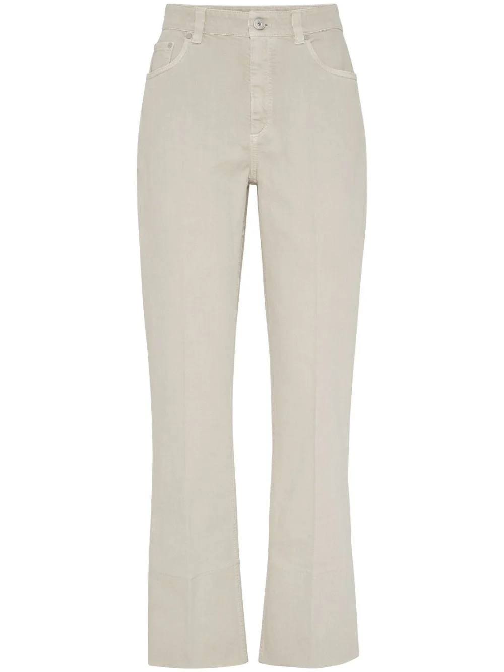 stretch-cotton kick-flare trousers Highlights - Ivory white - Garment dyed - Stretch-cotton - Kick-flare silhouette - High waist - Belt loops - Front button and zip fastening - Pressed crease - Classic five pockets Made in Italy Composition Cotton 99%, Spandex/Elastane 1% Washing instructions Read Manufacturer Guidelines
