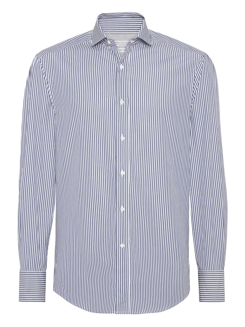 striped button-up shirt Highlights - White and navy blue - Vertical stripe pattern - Long sleeves - Button cuffs - Classic collar - Front button closure Made In Italy Composition pure cotton 100% Washing instructions Machine Wash