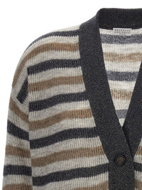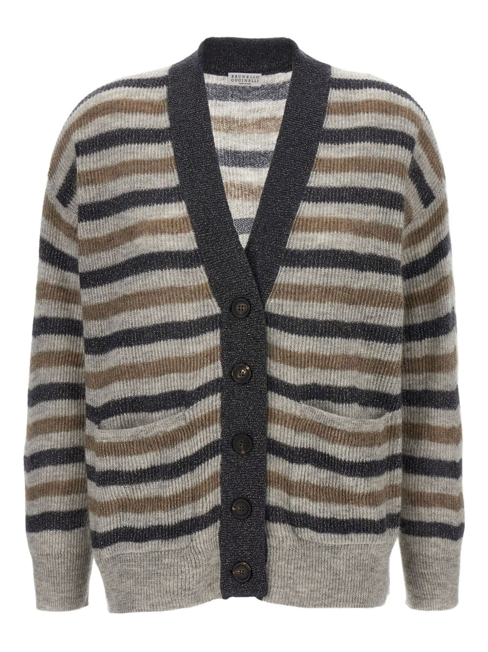 striped cardigan Highlights - Grey - Front button fastening - V-neck - Two front patch pockets - Ribbed trim Made in Italy Composition Mohair 42%, Polyamide 38%, Wool 12%, Metal 8% Washing instructions Dry Clean Only