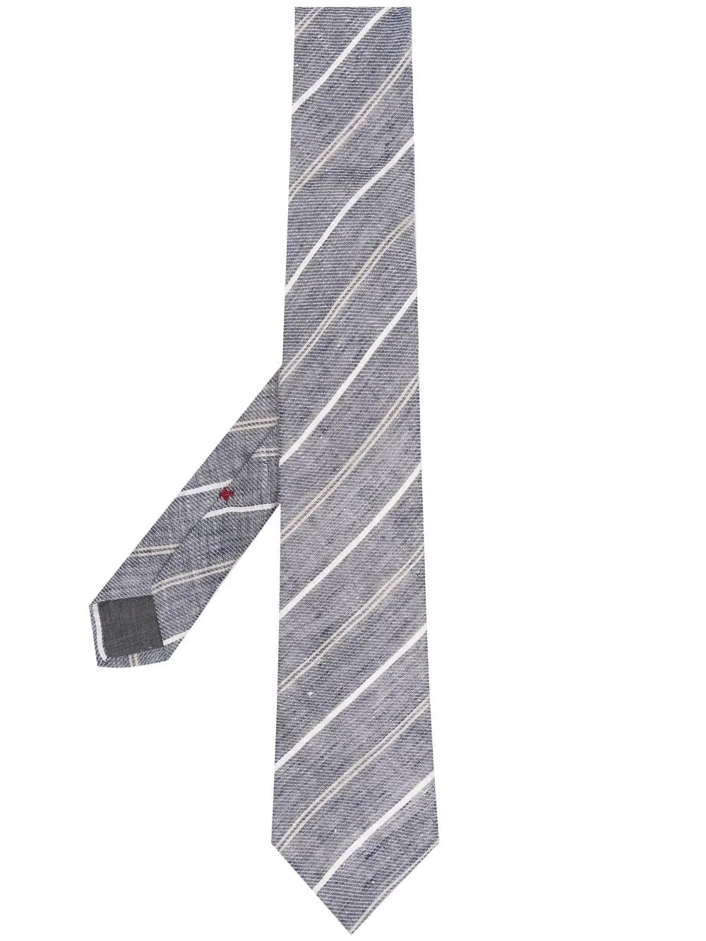 striped linen tie Highlights - Dark grey/off-white - Linen - Diagonal stripe pattern - Pointed tip - Wraparound style Made in Italy Composition Linen/Flax 100% SIZE & FIT Measurement WIDTH 2.75 in(6.9 cm) Washing instructions Dry Clean Only
