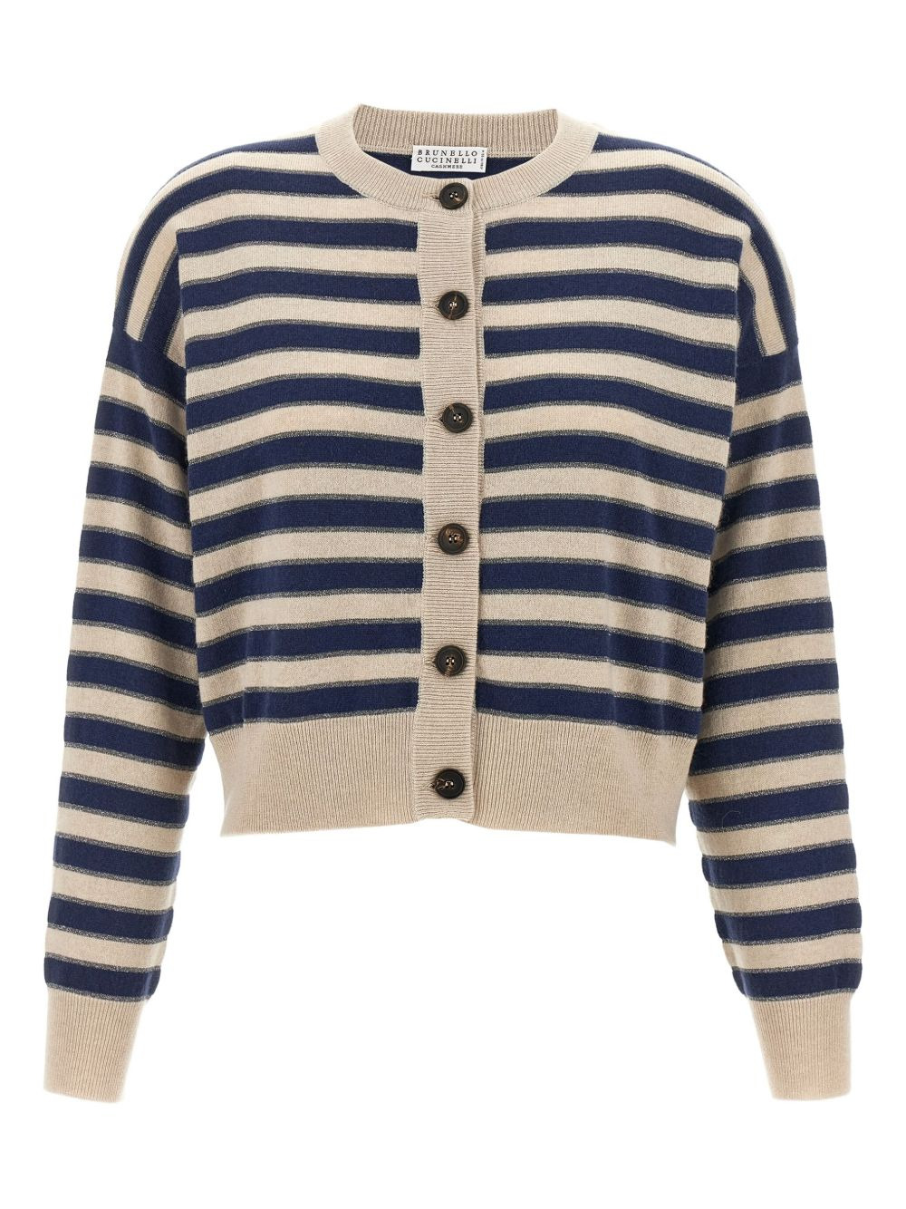 striped long-sleeves cardigan Highlights - Navy blue - Striped pattern - Crew neck - Button closure Made in Italy Composition Cashmere 100% Washing instructions Read Manufacturer Guidelines