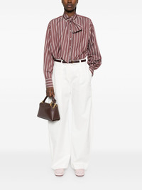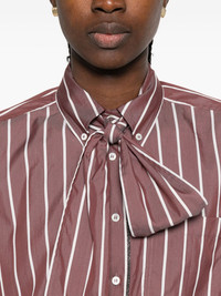 striped tie-neck top Highlights - Burgundy - Vertical stripes - Tie neck - Long sleeves - Button fastening - Chest pocket Made in Italy Composition Eco Brass 100%, Cotton 81%, Silk 19% SIZE & FIT Model measurements Height 5 ft 11 in(1.8 m) Bust/Chest 32.67 in(83 cm) Hips 36.22 in(92 cm) Waist 24.4 in(62 cm) Washing instructions Hand Wash