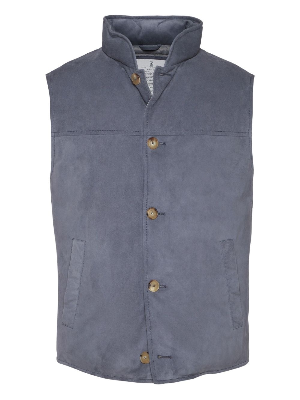 suede buttoned vest Highlights - Denim blue - Suede texture - Button fastening - High neck - Welt pockets - Quilted down filling Made in Italy Composition Outer: Leather 100% Goose Down 100% Washing instructions Specialist Cleaning