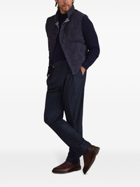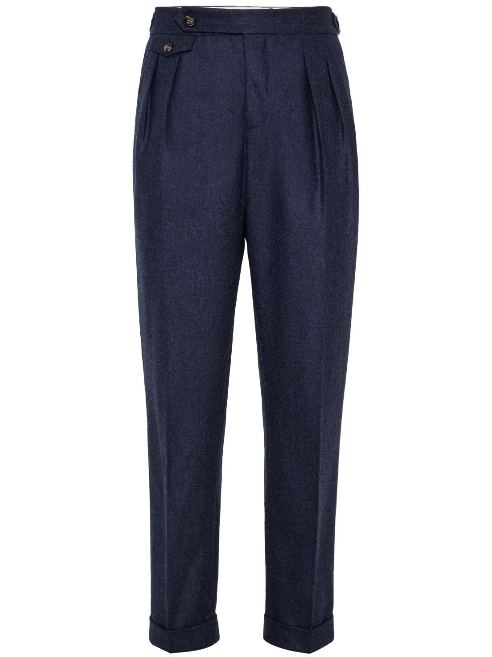 tailored tapered trousers Highlights - Navy blue - Box-pleat detail - Belt loops - Concealed fly and button fastening - Adjustable side straps - Tapered leg - Front flap pocket - Two side inset pockets - Two rear button-fastening jetted pockets - Rolled cuffs Made in Italy Composition Virgin Wool 100%