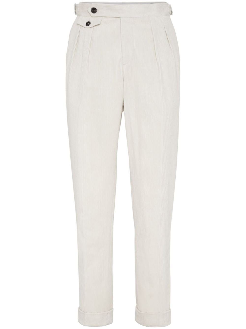 tailored trousers Highlights - White - Cotton-cashmere blend - Corduroy - Concealed fly and button fastening - Side buckle fastening - Mid-rise - Pleat detailing - Front flap pocket - Two side inset pockets - Two rear button-fastening pockets - Turn-up hem - Tapered leg Made in Italy Composition Cotton 91%, Cashmere 8%, Spandex/Elastane 1% Washing instructions Read Manufacturer Guidelines