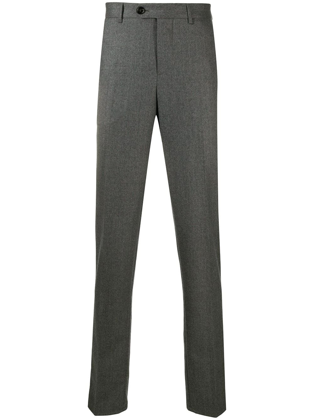 tailored wool trousers grey virgin wool front button fastening belt loops two side slit pockets two rear welt pockets Made in Italy Composition Lining: Cotton 100%, Viscose 100%, Acetate 60%, Cupro 40% Outer: Virgin Wool 100% SIZE & FIT Model measurements Height 6 ft 1 in(1.85 m) Bust/Chest 37.79 in(96 cm) Hips 37.4 in(95 cm) Waist 30.7 in(78 cm) FittingInformation This piece fits true to size. We recommend you get your regular size Regular fit Made with a mid-weight non-stretch fabric Washing instructions Dry Clean Only