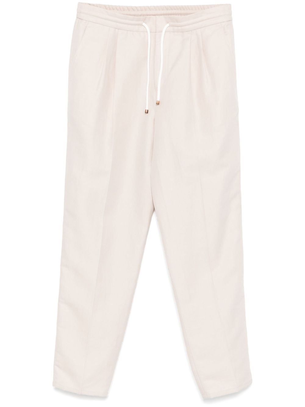 tapered trousers Highlights - Light beige - Elasticated drawstring waistband - Concealed front button, hook and zip fastening - Two side slash pockets - Two rear welt pockets Made in Italy Composition Outer: Linen/Flax 56%, Cotton 46% Lining: Cotton 100% SIZE & FIT Model measurements Height 6 ft 2 in(1.87 m) Bust/Chest 37.79 in(96 cm) Hips 37.79 in(96 cm) Waist 30.31 in(77 cm) FittingInformation Designed for a tapered leg, offering a loose unrestricted fit over the leg with a closer fit towards the ankle Adjust this piece’s waistband to your preference using the drawstring Made from a midweight non-stretch fabric, this piece offers minimal elasticity when worn