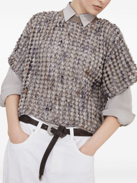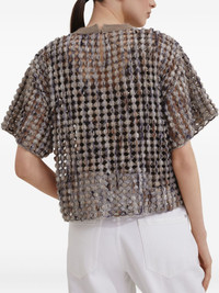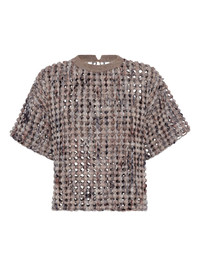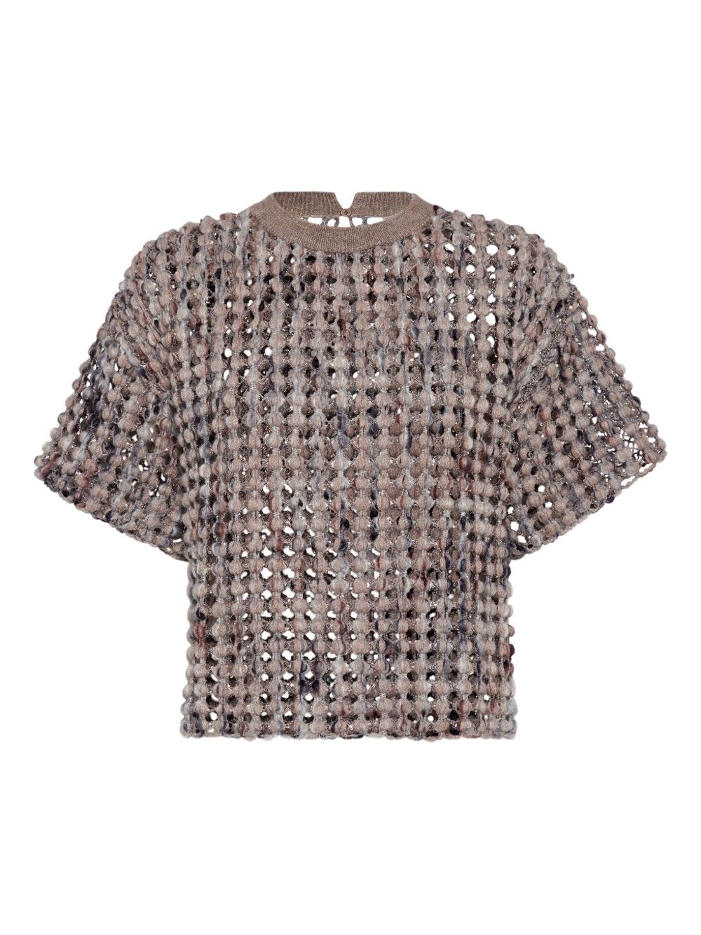 textured short-sleeve top Highlights - Taupe brown - Open-knit design - Round neck - Dropped shoulder seams Made in Italy Composition Fabric 51%, Virgin Wool 26%, Nylon 23%