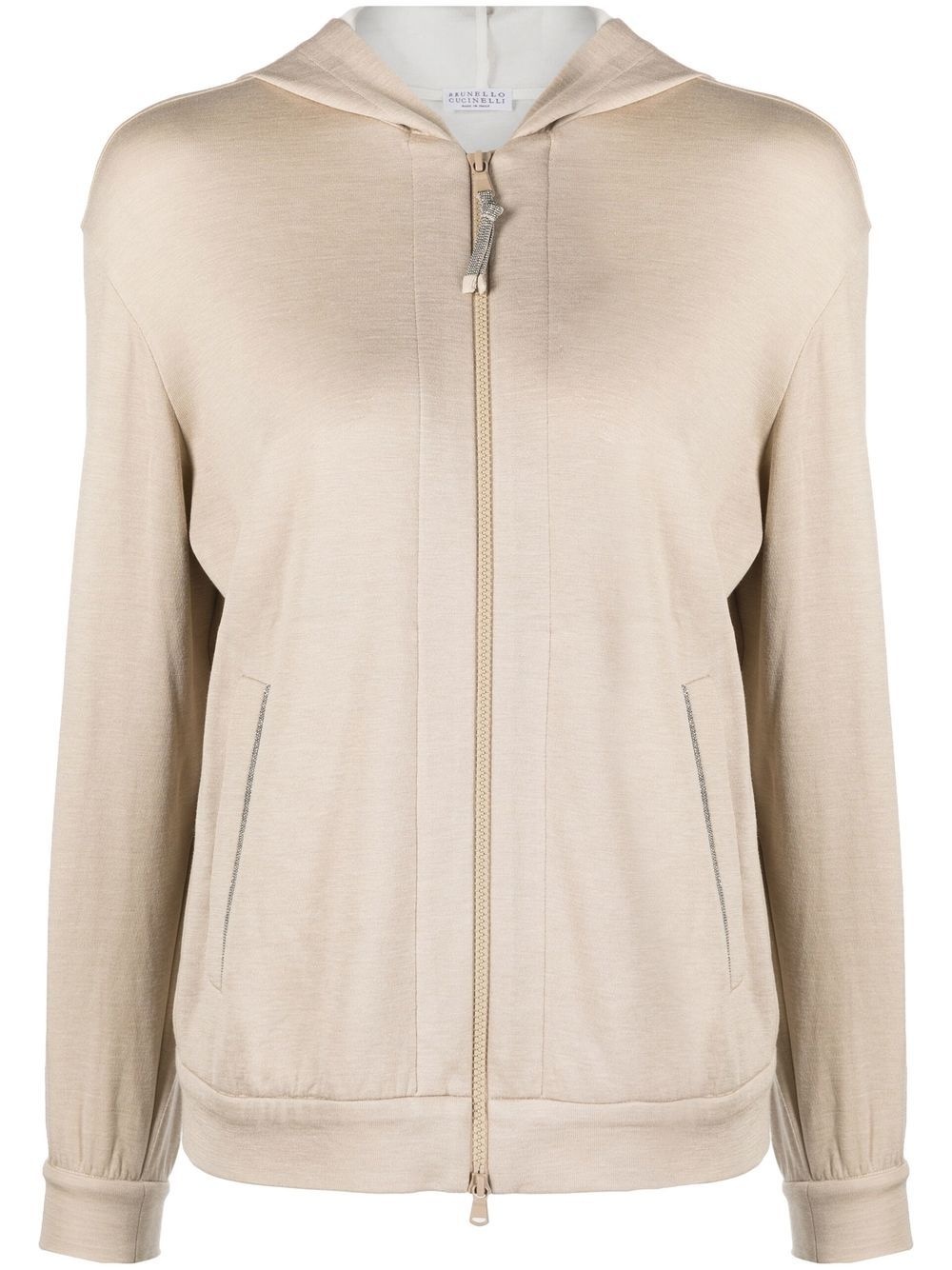 two-pocket zip-up hoodie beige cotton-silk blend classic hood front zip fastening long sleeves fitted-cuff sleeves two side slit pockets straight hem Made in Italy Composition Cotton 67%, Silk 31%, Polyamide 2% SIZE & FIT Model measurements Height 5 ft 10 in(1.79 m) Bust/Chest 31.1 in(79 cm) Hips 35.03 in(89 cm) Waist 24.01 in(61 cm) FittingInformation This piece fits true to size. We recommend you get your regular size Cut for a relaxed fit Made with a mid-weight fabric Washing instructions Hand Wash