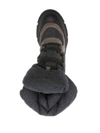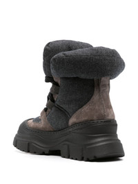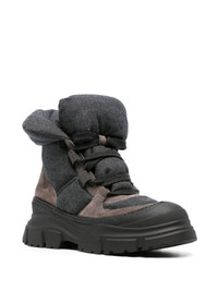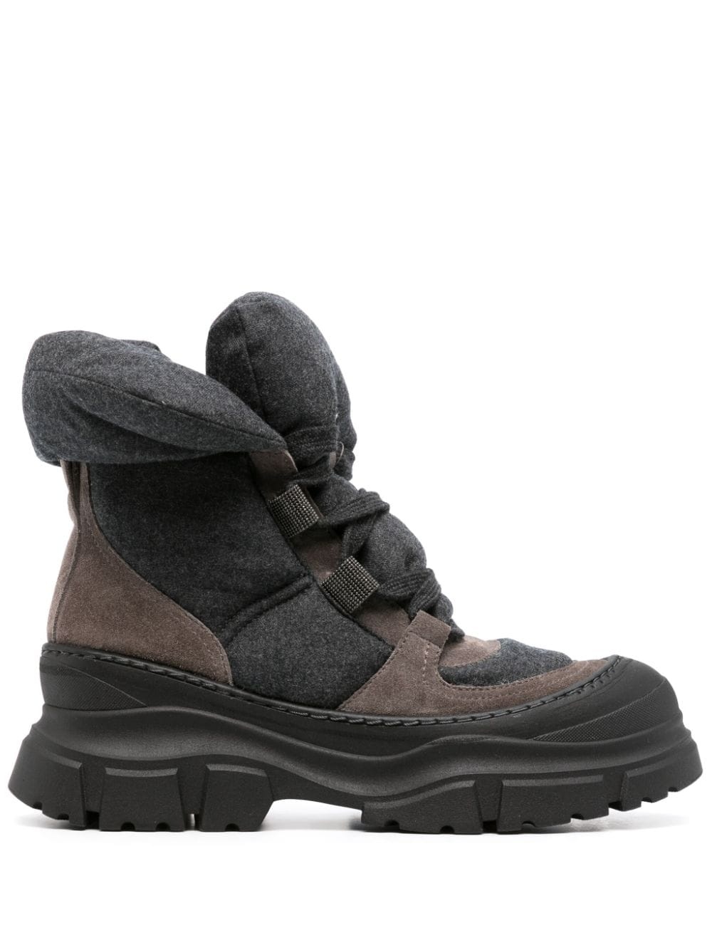 two-tone panelled ankle boots Highlights - Brown/grey - Virgin wool - Two-tone panelled design - Rhinestone embellishment - Round toe - Ankle-length - Rubber toecap - Front lace-up fastening - Chunky rubber sole Made in Italy Composition Outer: Virgin Wool 100% Lining: Fabric 100% Sole: Rubber 100% SIZE & FIT Measurement HEEL 1.96 in(5 cm) HEIGHT 5.9 in(15 cm) Sole height 1.37 in(3.5 cm)