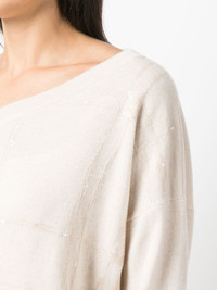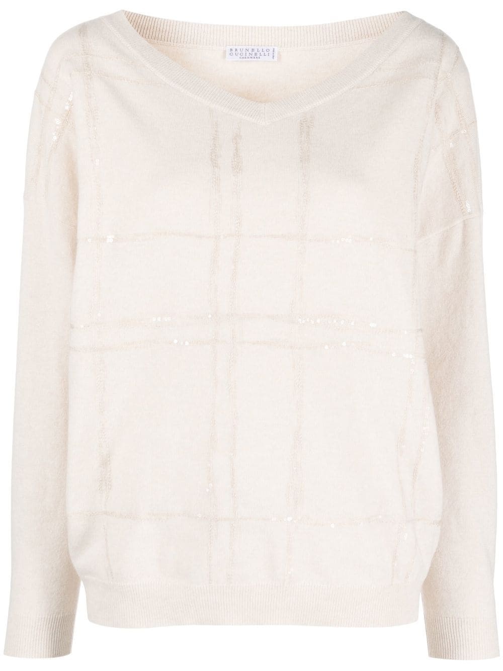 V-neck cashmere jumper light beige cashmere-cotton blend sequin detailing fine knit ribbed-knit edge V-neck long sleeves straight hem Made in Italy Composition Polyester 100%, Cashmere 100%, Cotton 100% SIZE & FIT Model measurements Height 5 ft 11 in(1.8 m) Bust/Chest 33.07 in(84 cm) Hips 37.4 in(95 cm) Waist 25.19 in(64 cm) FittingInformation This piece fits true to size. We recommend you get your regular size Cut for a relaxed fit Made with a mid-weight fabric Washing instructions Hand Wash