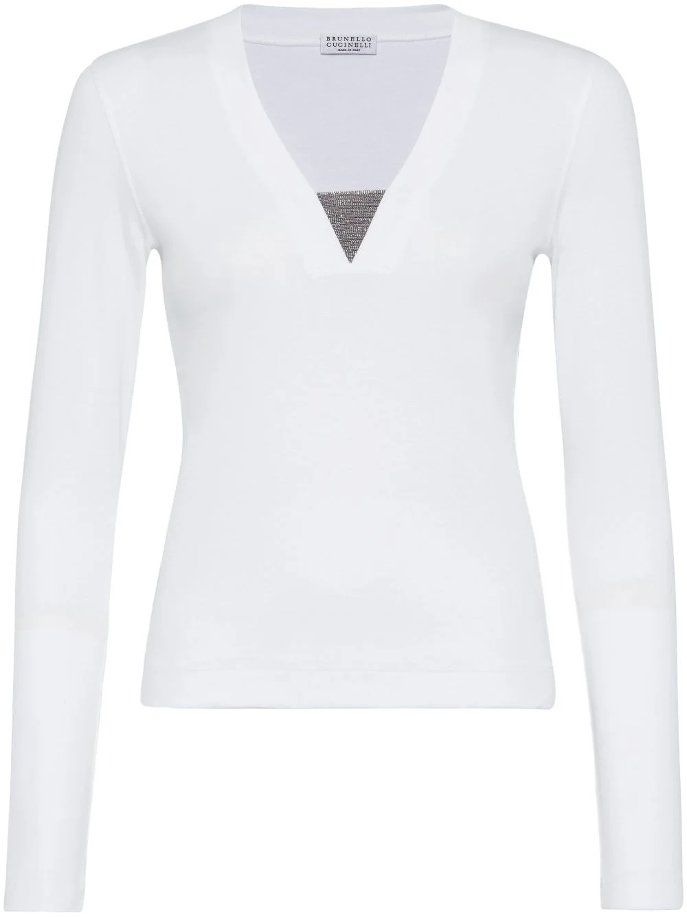 V-neck long-sleeve top Brunello Cucinelli pairs modern designs with classic Italian craftsmanship. Showcased on this long-sleeve top from the AW22 collection, the garment is constructed from opulent materials such as silk and has a sophisticated contrasting panel detail at the front. Made in Italy Composition Cotton 94%, Acetate 74%, Silk 26%, Spandex/Elastane 6% SIZE & FIT Model measurements Height 5 ft 11 in(1.8 m) Bust/Chest 31.49 in(80 cm) Hips 35.82 in(91 cm) Waist 24.8 in(63 cm) FittingInformation This piece fits true to size. We recommend you get your regular size Cut for a slim fit Made with a mid-weight stretch fabric Washing instructions Dry Clean Only