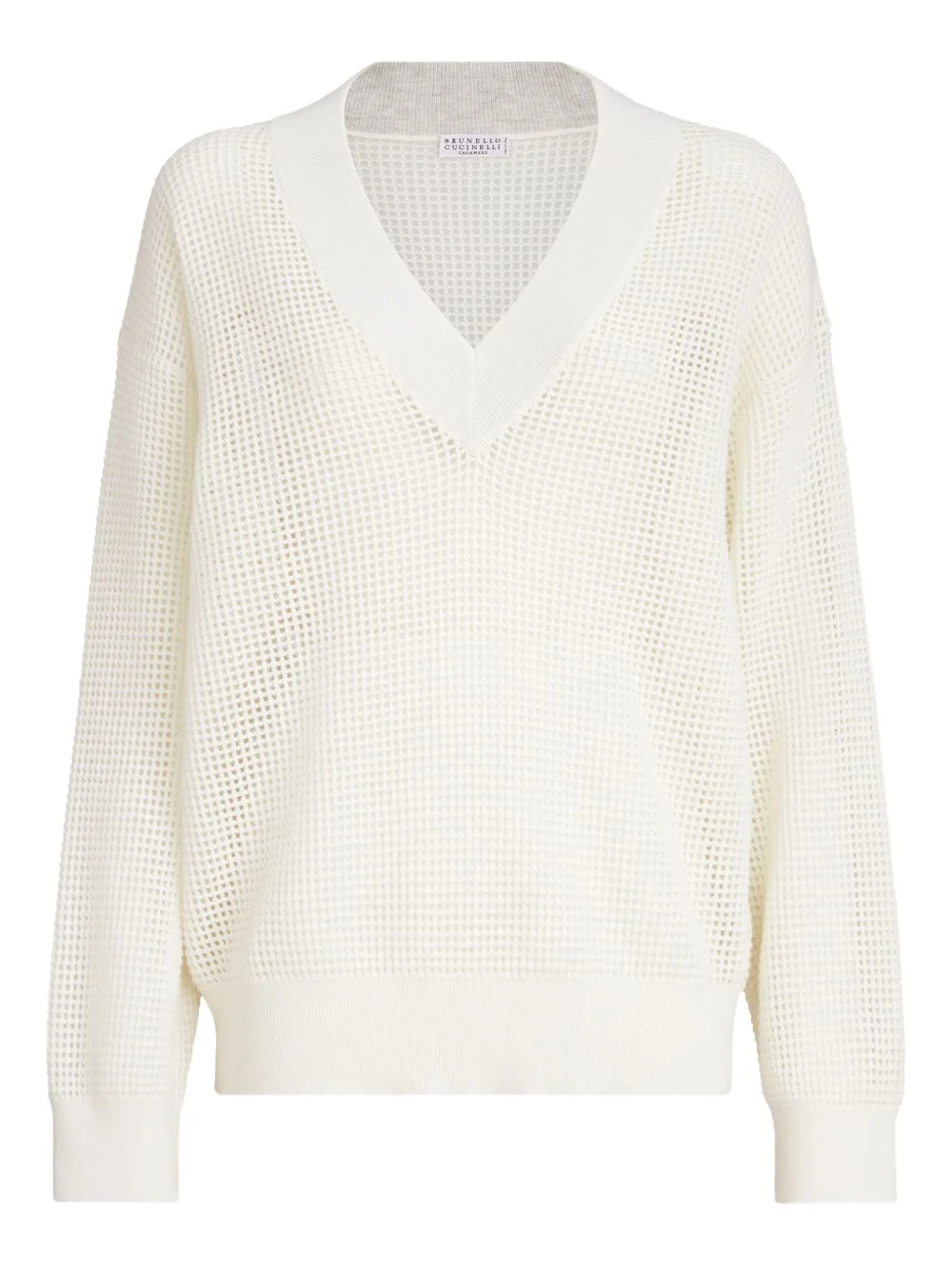 V-neck sweater Highlights - White - Net design - V-neck - Long sleeves - Ribbed hem - Ribbed cuffs Made in Italy Composition Cashmere 100% Washing instructions Read Manufacturer Guidelines