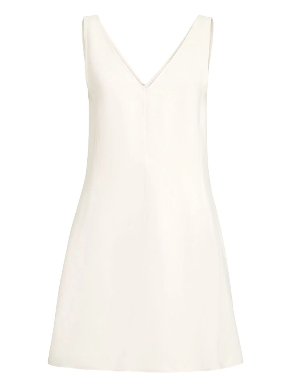 V-neck twill mini dress Highlights - Ivory - V-neck - Sleeveless - Twill weave - Fluid silhouette Made in Italy Composition Viscose 72%, Eco Linen 28% Washing instructions Read Manufacturer Guidelines