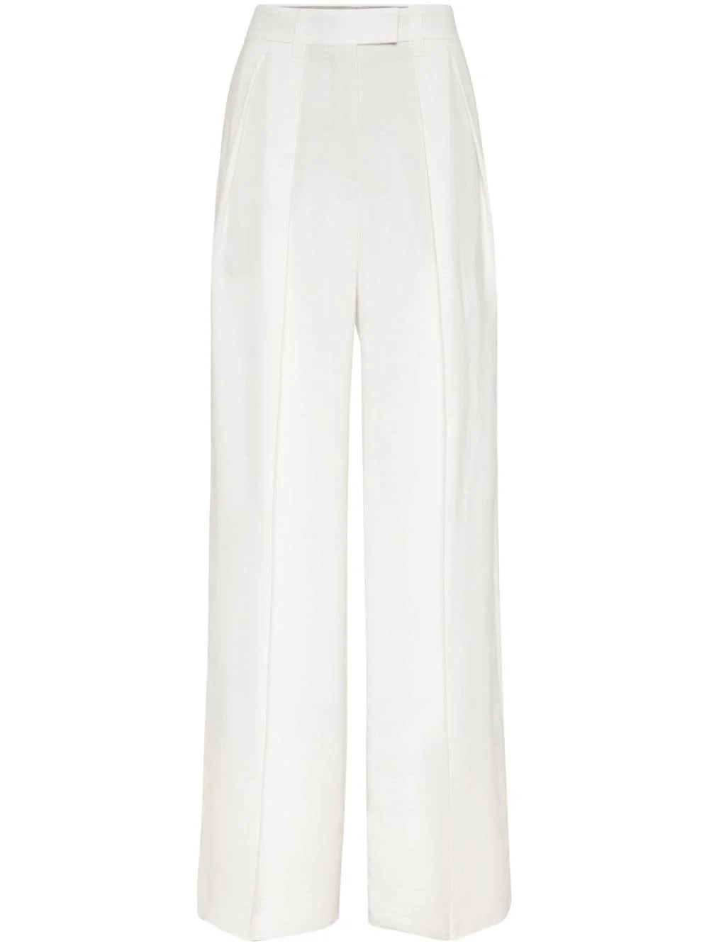wide-leg tailored trousers Highlights - Light beige - Pressed crease - Pleat detailing - Tailored design - High-waisted - Concealed front fastening - Belt loops - Wide leg - Two side slit pockets - Two rear welt pockets - Long length Made in Italy Composition Viscose 73%, Linen/Flax 27% Washing instructions Read Manufacturer Guidelines