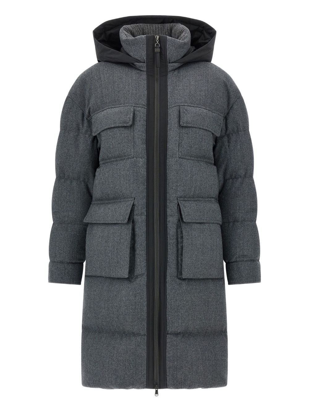 wool down quilted coat Highlights - Grey - Quilted design - Water repellent treatment - Removable hood - Standing collar - Zip closure - Side zip slits Made in Italy Composition Outer: Virgin Wool 100% Lining: Nylon 100%, Goose Down 100% Washing instructions Read Manufacturer Guidelines