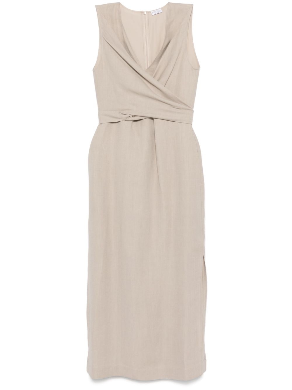 wrap-effect midi dress Highlights - Light beige - Rear zip fastening - Self-tie fastening - Side slits - Two side slash pockets Made in Italy Composition Lining: Acetate 74%, Silk 26% Outer: Viscose 73%, Linen/Flax 27% SIZE & FIT Model measurements Height 5 ft 9 in(1.75 m) Bust/Chest 31.88 in(81 cm) Hips 34.64 in(88 cm) Waist 24.01 in(61 cm) FittingInformation Designed for a close fit at the chest and waist with a loose fit at the hip The adjustable tie waist gives a more adaptable and personalised fit Made from a midweight non-stretch fabric
