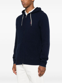 zip-up hooded cardigan Highlights - Navy blue - Ribbed knit - Drawstring hood - Zip fastening - Kangaroo pocket - Embroidered logo Made in Italy Composition Eco Brass 100%, Cashmere 100% SIZE & FIT Model measurements Height 6 ft 1 in(1.85 m) Bust/Chest 38.58 in(98 cm) Hips 37 in(94 cm) Waist 30.31 in(77 cm) Washing instructions Hand Wash