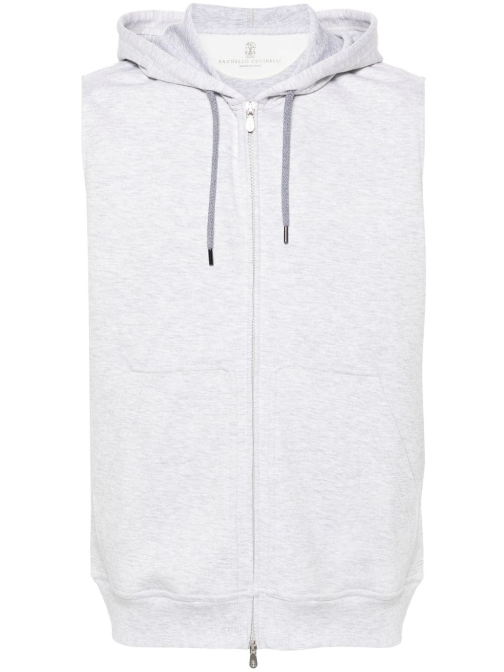 zip-up hoodie Highlights - Grey - Cotton blend - Jersey texture - Melange effect - Front two-way zip fastening - Drawstring hood - Sleeveless - Two front pouch pockets - Straight hem Made in Italy Composition Cotton 64%, Polyamide 26%, Cashmere 6%, Silk 4% SIZE & FIT Model measurements Height 6 ft 2 in(1.87 m) Bust/Chest 38.18 in(97 cm) Hips 36.61 in(93 cm) Waist 29.13 in(74 cm) FittingInformation Designed for a regular fit, offering a comfortable loose fit throughout the body The ribbed hem offers a close, comfortable fit Made from a midweight non-stretch fabric, this piece offers minimal elasticity when worn