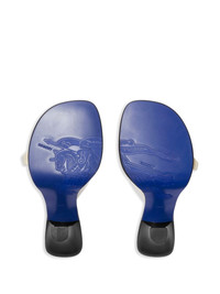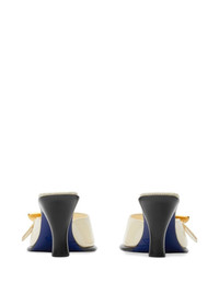 Bay leather mules Burberry's Bay mules feature a wide strap with a shield plaque enamelled with the brand's famous Equestrian Knight Design. They're made in Italy from calf leather, in cream white shade. Highlights - Cream white - Lambskin/calf leather - Gold-tone hardware - Open toe - Side buckle fastening - Slip-on style - Branded insole Made in Italy Composition Lining: Lambskin 100% Outer: Calf Leather 100% Sole: Leather 100% SIZE & FIT Measurement HEEL 3.14 in(8 cm)