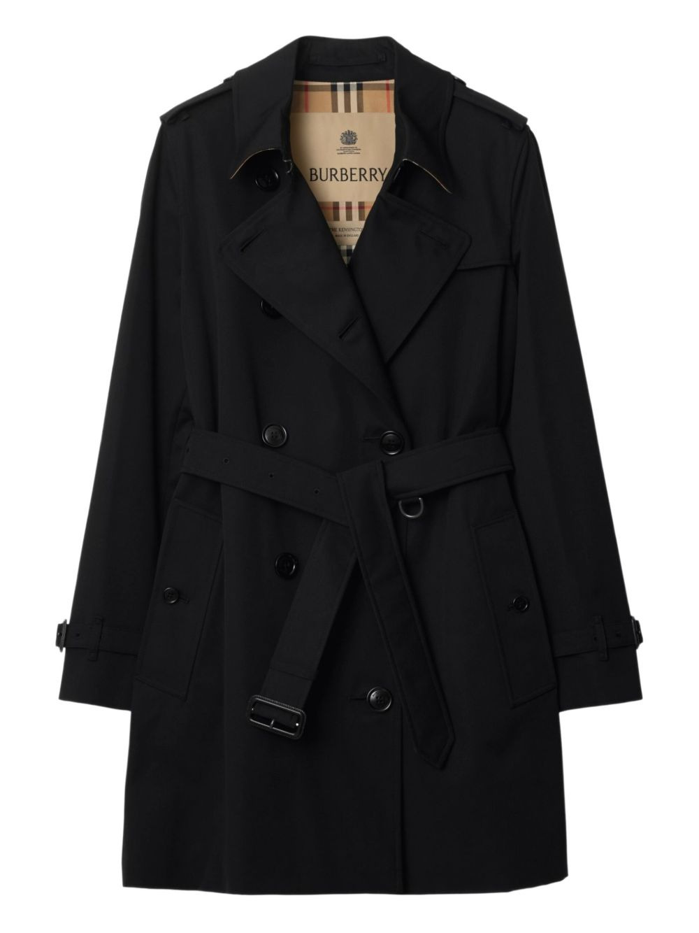 belted double-breasted trench coat Highlights - Black - Double-breasted button closure - Epaulettes - Belted cuffs Made in United Kingdom Composition Outer: Cotton 100% Lining: Cotton 100%, Viscose 100% Washing instructions Read Manufacturer Guidelines