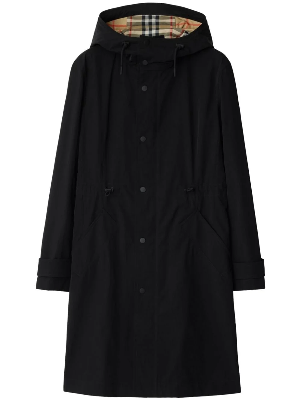 button-up recycled nylon parka Highlights - Black - Recycled nylon - Drawstring hood - Drawstring waist - Front button fastening - Long sleeves - Buttoned-cuff sleeves - Contrast lining - Thigh-length Imported Composition Outer: Cotton 32%, Polyamide 18% Lining: Polyester 100% Recycled Nylon 50%