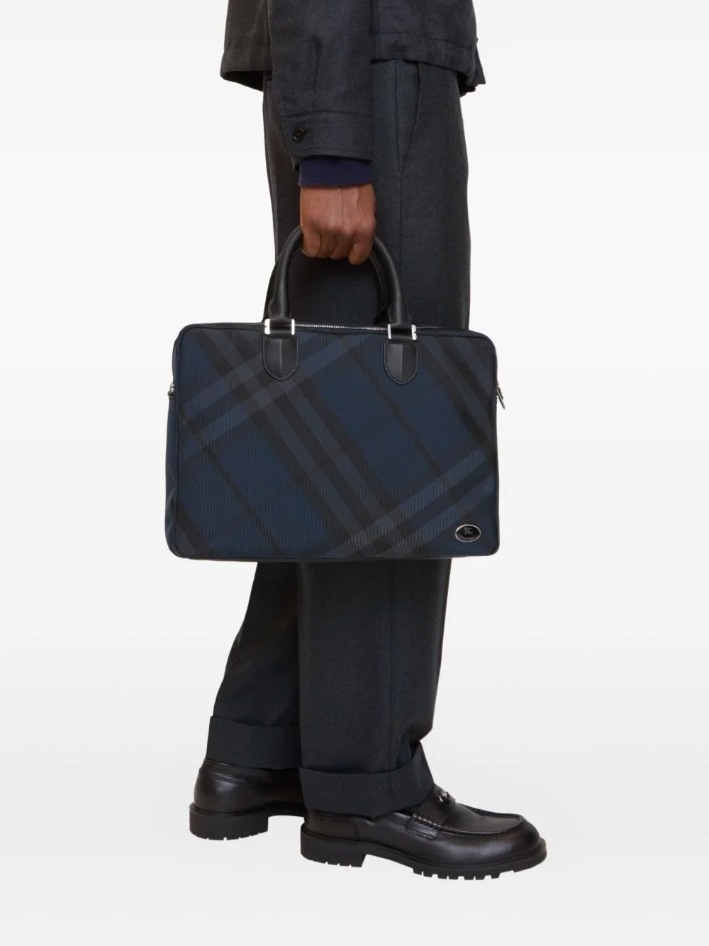 check briefcase Highlights - Dark blue - Check pattern - Top handles - Detachable adjustable strap - Zip closure - Logo metal - Interior zip pocket Imported Composition Outer: Nylon 100%, Leather 100% Lining: Nylon 95%, Polyurethane 5% SIZE & FIT Measurement DEPTH 3.54 in(9 cm) HEIGHT 10.62 in(27 cm) WIDTH 14.96 in(38 cm)