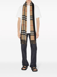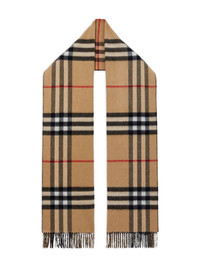 check cashmere reversible scarf Highlights - Black/archive beige - Cashmere - Vintage check pattern - Fringe detailing - Wraparound style Made in United Kingdom Composition Cashmere 100% SIZE & FIT Measurement LENGTH 82.67 in(210 cm) WIDTH 19.68 in(50 cm)