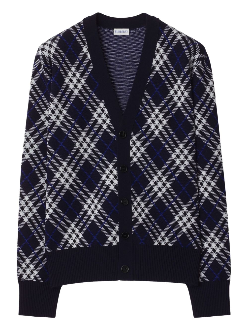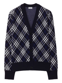 check-pattern cardigan Highlights - Navy blue - Button fastenings - V-neckline - Ribbed cuffs and hem Imported Composition Buffalo Horn 100%, Wool 92%, Polyester 8% Washing instructions Dry Clean Only