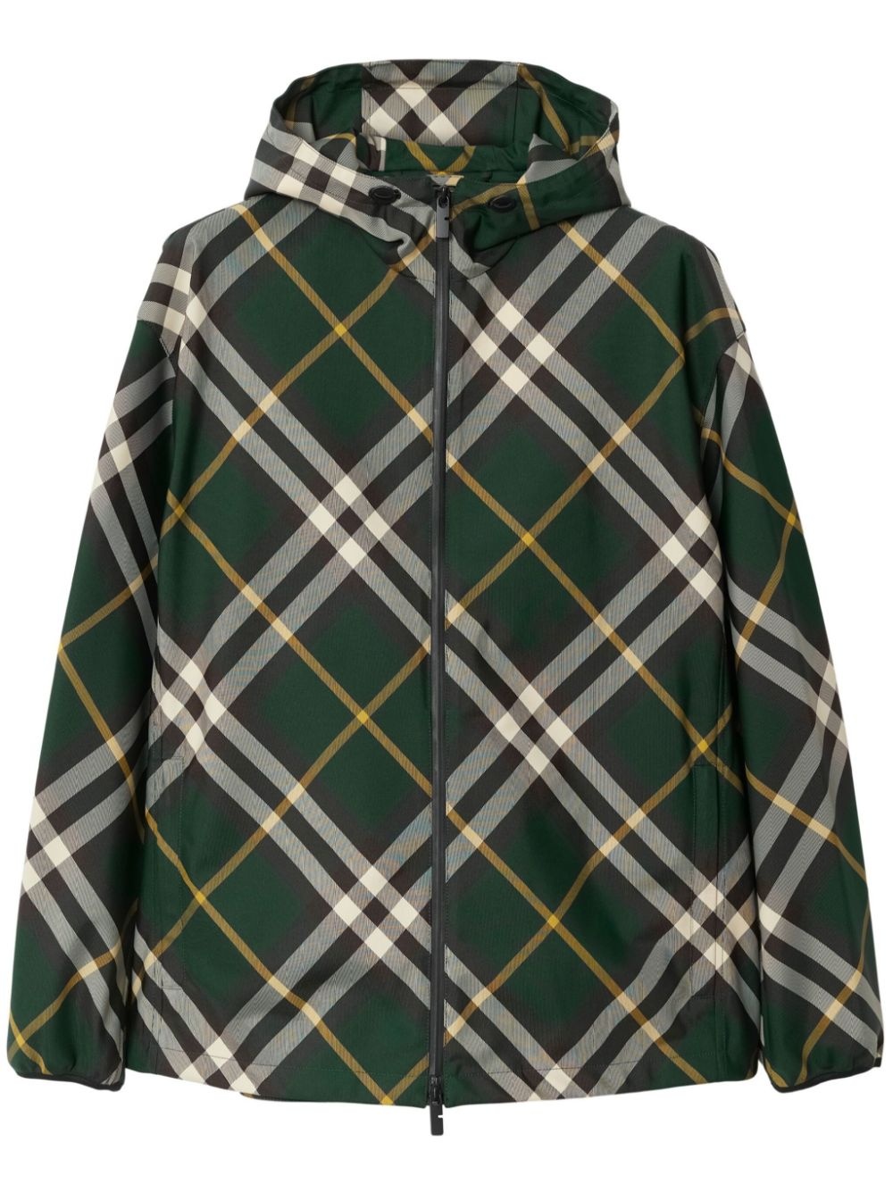check-pattern zipped hooded jacket Highlights - Green - Signature equestrian knight motif - Embroidered logo - Check pattern - Drawstring hood - Front zip fastening - Long sleeves - Two front welt pockets - Straight hem Made in Italy Composition Lining: Polyester 100%, Polyamide 100% Outer: Polyester 100% Washing instructions Dry Clean Only
