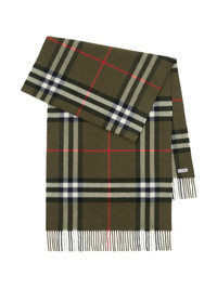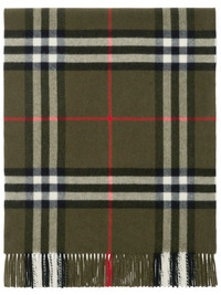 check-print fringed cashmere scarf Highlights - Olive green - House check pattern - Cashmere - Fringed edge - Logo tag - Long length Made in United Kingdom Composition Cashmere 100% SIZE & FIT Measurement LENGTH 78.74 in(200 cm) WIDTH 20.47 in(52 cm)