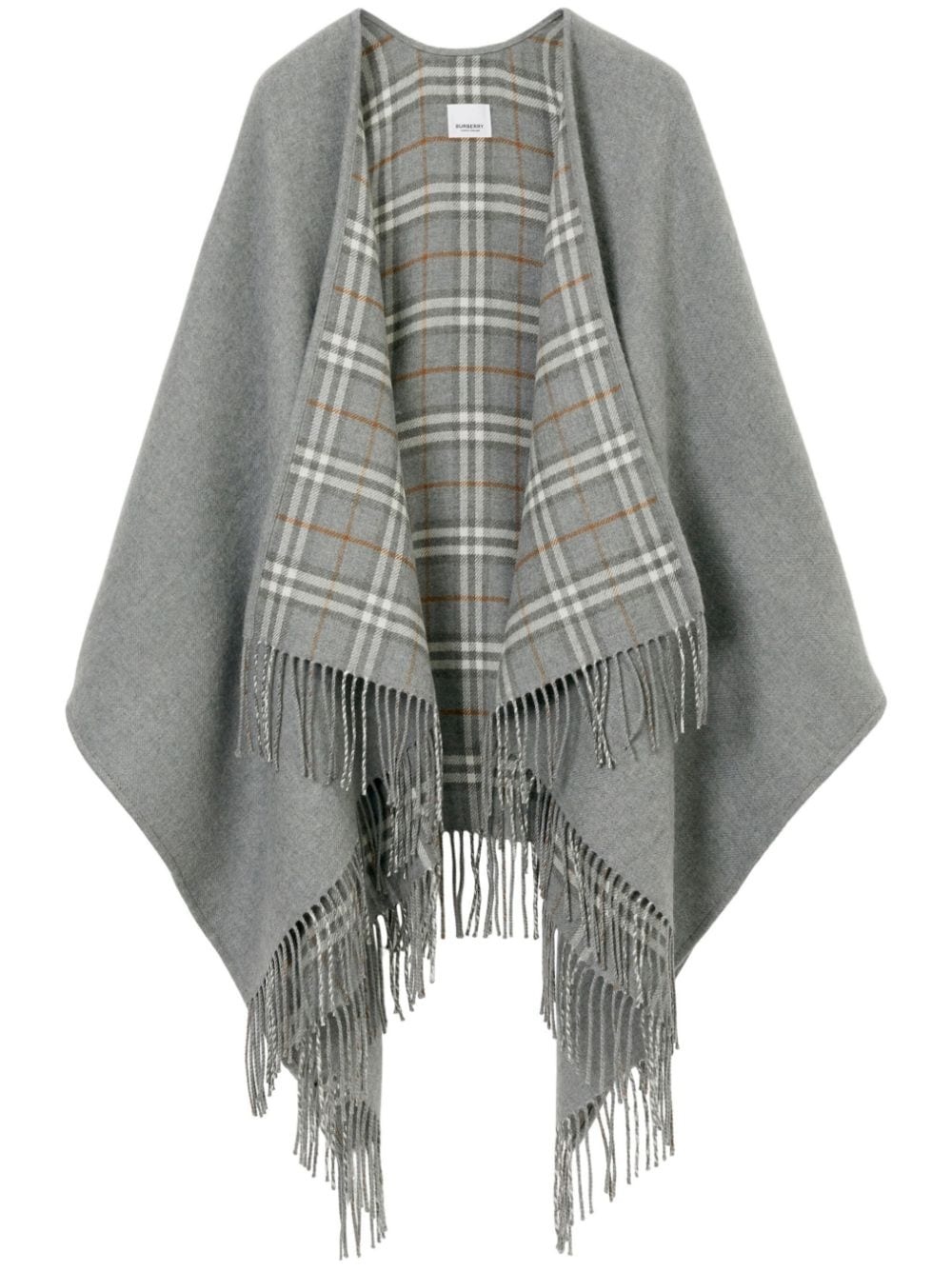 check-print reversible wool cape Highlights - Grey - Wool - Check print - Fringed edge - Open front - Reversible Made in United Kingdom Composition Wool 100%
