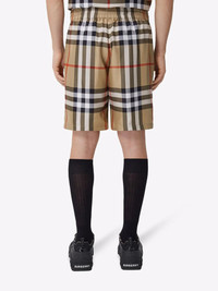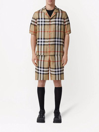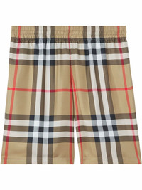 check-print silk shorts Crafted from silk, these Burberry shorts boast an effortless straight-leg silhouette. An all-over Vintage Check adds a bold touch to this casual pair. Highlights - Archive beige - Silk - Vintage check pattern - Elasticated waistband - Straight leg Made in Italy Composition Silk 100% Washing instructions Dry Clean Only