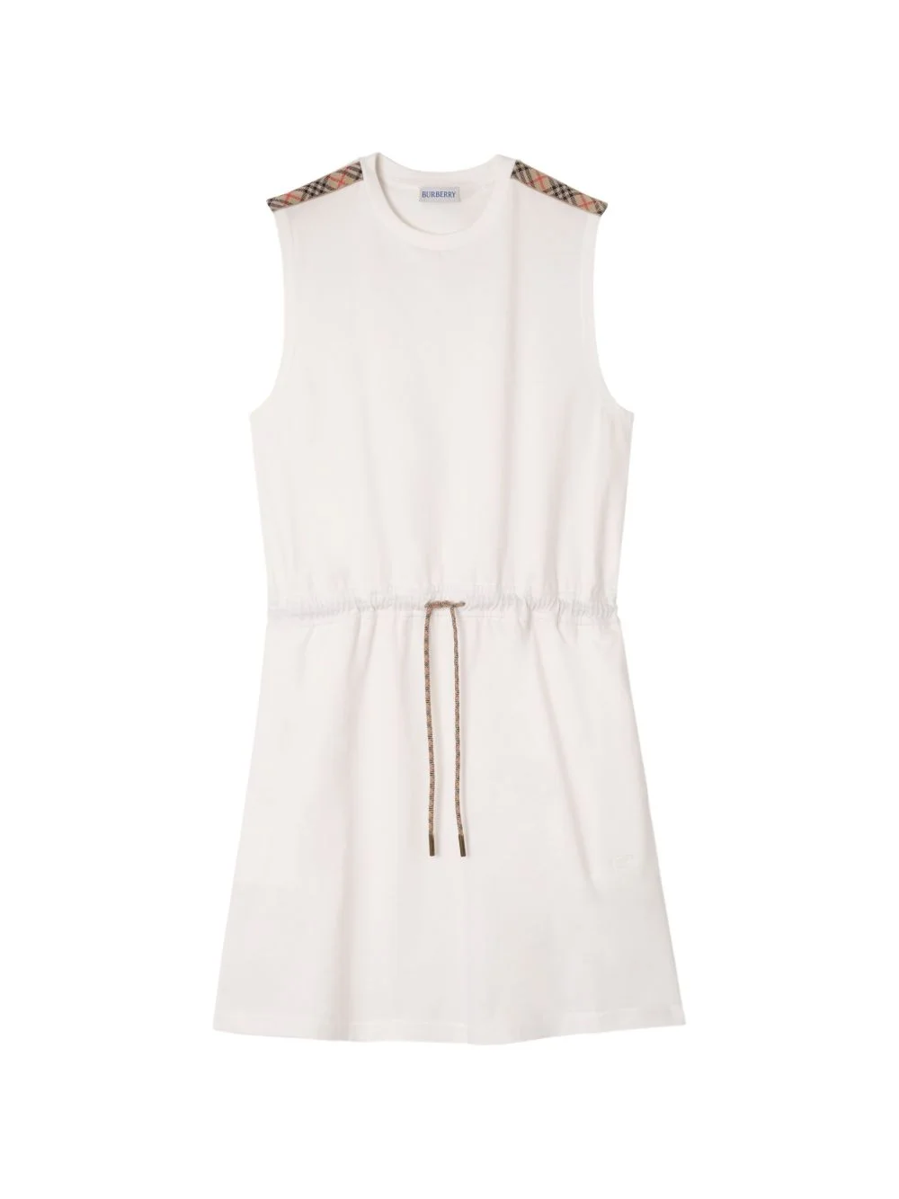 check trim cotton jersey dress Highlights - A sleeveless dress in lightweight cotton jersey, perfect for warm weather. the design features burberry check taping in signature archive beige and our embroidered equestrian knight design. - Drawcord waist - Side slip pockets - Embroidered equestrian knight - Relaxed fit: a looser cut than our regular fit Imported Composition Outer: Cotton 100% Polyester 100% Washing instructions Machine Wash