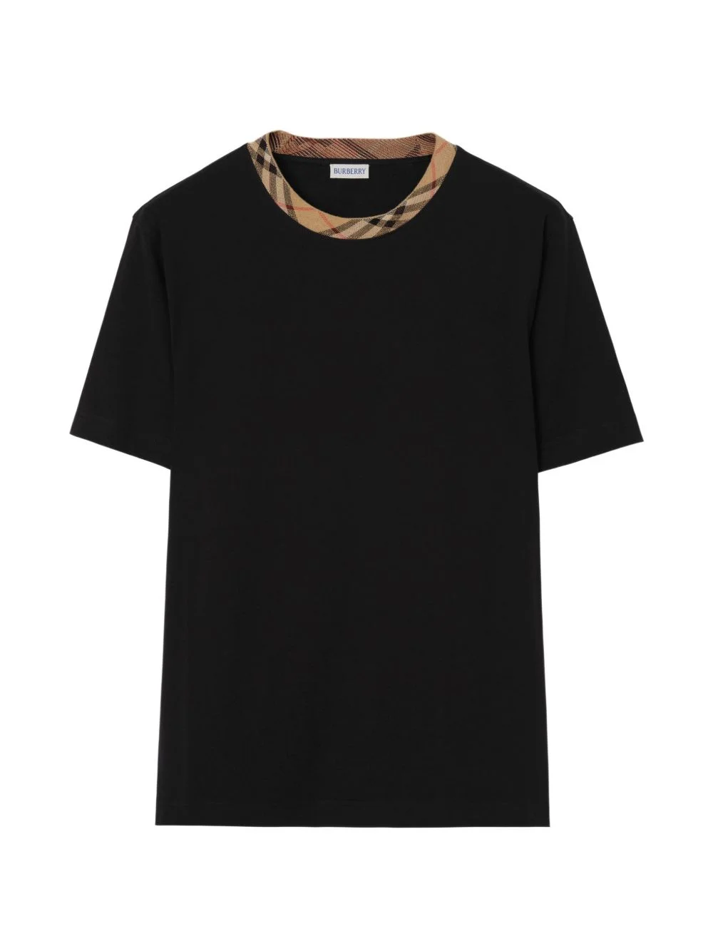 check trim cotton t-shirt Highlights - A crew-neck t-shirt in cotton jersey, cut to a relaxed fit. the collar is detailed with burberry check taping in our signature sand beige. - Rib-knit neckline - Short-sleeves - Relaxed fit: a looser cut than our regular fit. Imported Composition Cotton 100% Washing instructions Machine Wash