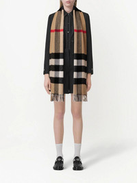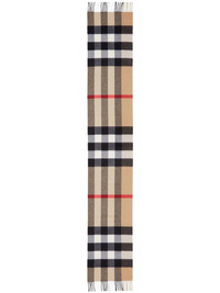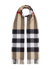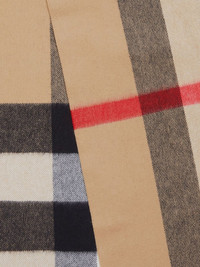 checked cashmere scarf Burberry's scarf features two brand signatures. This cashmere iteration has a checked pattern and archive beige hue - two of the label's most recognised emblems. Highlights - Archive beige - Check pattern - Cashmere - Fringe detailing Made in United Kingdom Composition Cashmere 100% SIZE & FIT Measurement LENGTH 78.74 in(200 cm) WIDTH 14.17 in(36 cm)