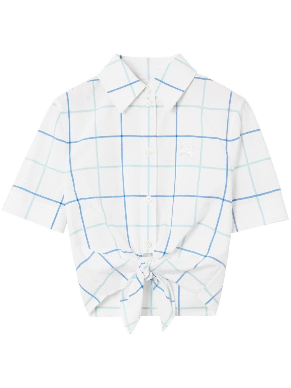 checked cropped cotton shirt Highlights - White/cerulean blue/light blue - Cotton - Poplin texture - Check pattern - Signature equestrian knight motif - Classic collar - Front button fastening - Tied waist - Short sleeves - Cropped Imported Composition Cotton 100% Washing instructions Machine Wash