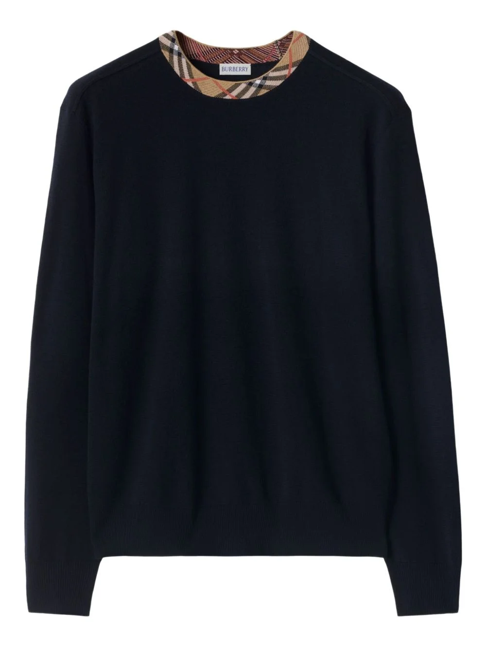 checked-trim wool sweater Highlights - Midnight blue - Ribbed cuffs and hem - Crew neck - Long sleeves Imported Composition Wool 100%, Cotton 93%, Polyamide 6%, Elastane 1% Washing instructions Dry Clean Only