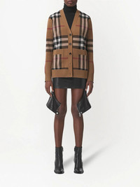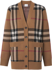 checked wool-cashmere blend cardigan Burberry's cardigan celebrates one of the brand's most enduring motifs - the ubiquitous checked pattern. Spun from birch-brown wool-cashmere yarns, it decorates the entirety of this cosy iteration. Imported Composition Wool 70%, Cashmere 30% SIZE & FIT Measurement SLEEVE LENGTH 23.22 in(59 cm) Shoulder Width 14.96 in(38 cm) LENGTH 26.37 in(67 cm) BUST 36.22 in(92 cm) Washing instructions Dry Clean Only